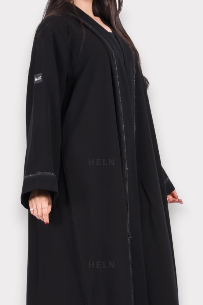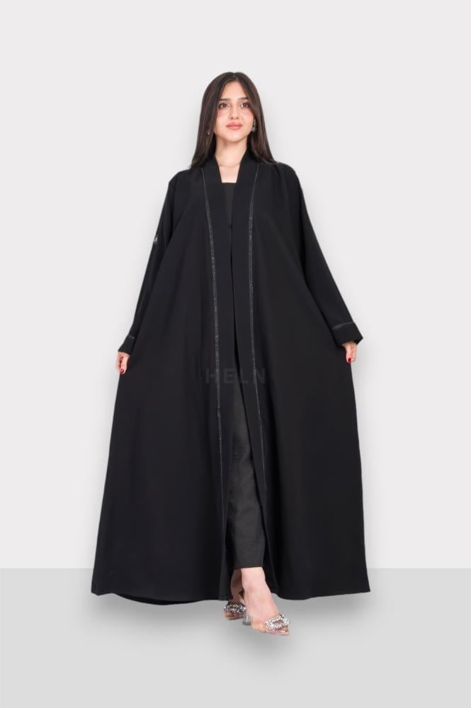 عباية شكبوكس SHIKBOX، عباية كلوش ناعمة سوداء بقماش باربي فاخر، تصميم كلوش بقصة واسعة من الأسفل يعطيها مظهراً أنيقاً ومريحاً، قماش الباربي معروف بلمعانه الخفيف بلمسة من الشك البوكس يضيف تفاصيل جميلة على العباية.