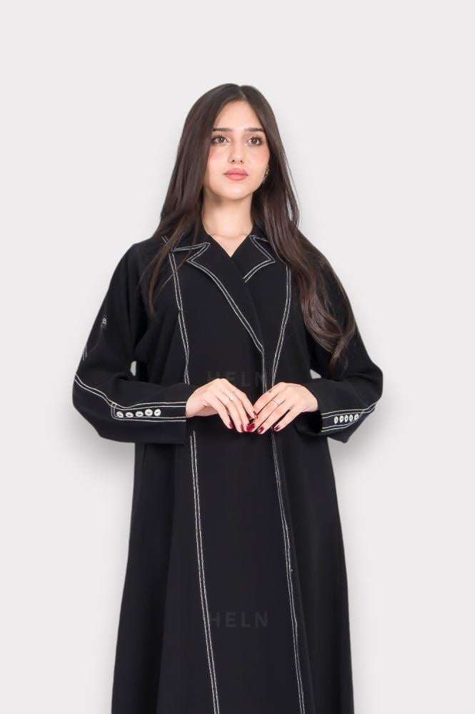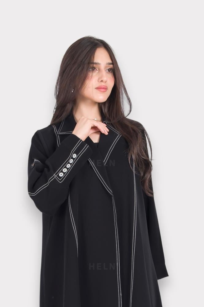 عباية تاور TOWER، قماش باربي بقصة فرنسية باللون الأسود تتميز بتصميم أنيق، الأكمام تحتوي على 5 أزرار مما يضيف لمسة فريدة على العباية، اللون الاسود يجعلها سهلة التنسيق مع مختلف الأزياء والإكسسوارات.