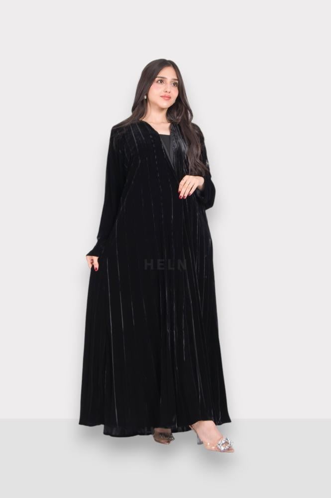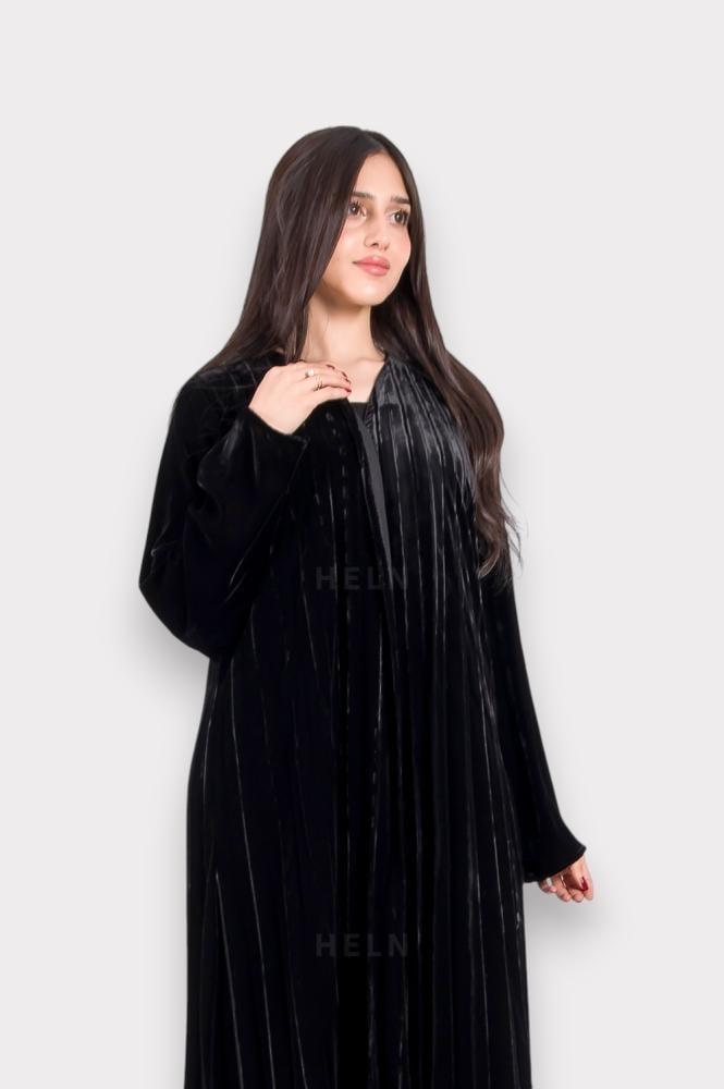 عباية فانتا بلاك VANTA BLACK، عباية مخملية سوداء بقماش مكسر، المخمل يعطيها مظهراً أنيقاً وفاخراً، القماش المكسر يضيف لمسة جمالية مميزة.