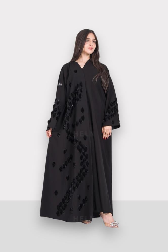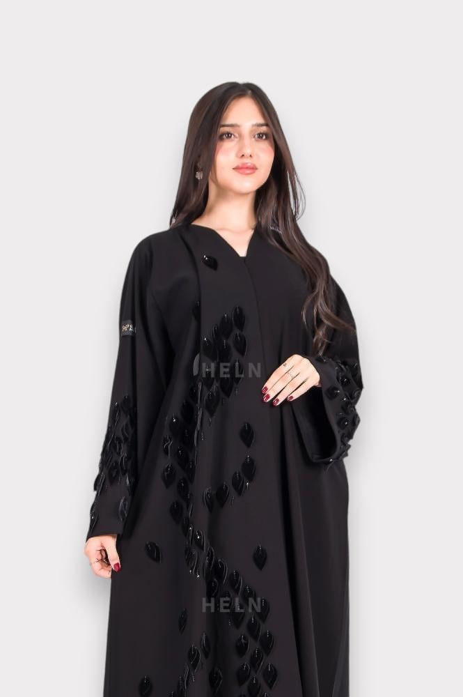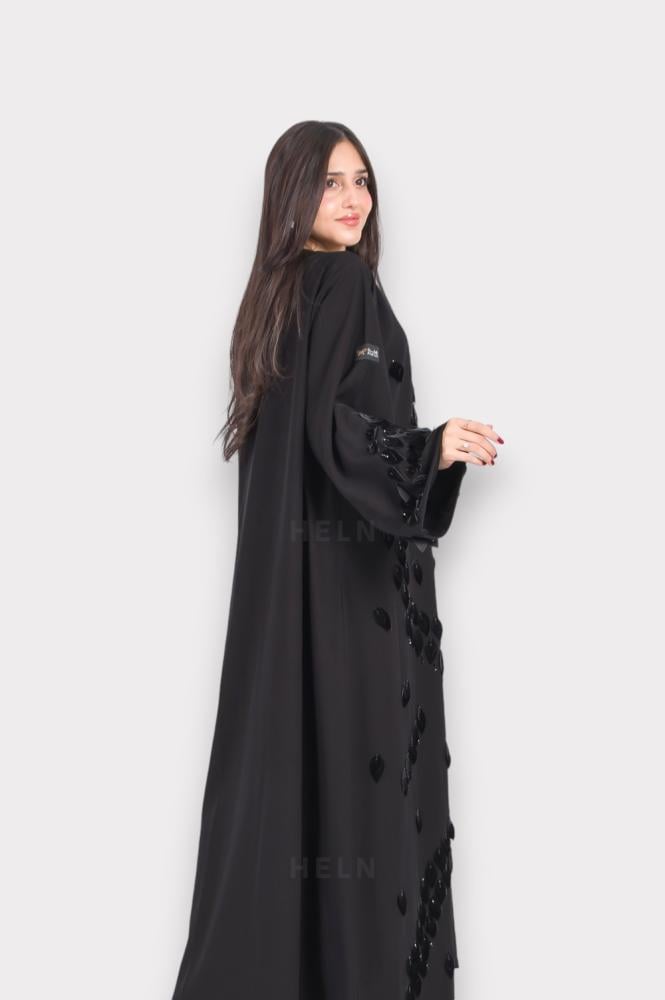 عباية الدموع السوداء BLACK TEARS، عباية سوداء كريب إندونيسي فاخر، ناعمة بشك دموع يدوي، قصة كم مربع تتميز بخفتها ومرونتها مما يجعلها مريحة جداً للارتداء، القماش الكريب يعطيها مظهراً سلساً وأنيقاً.